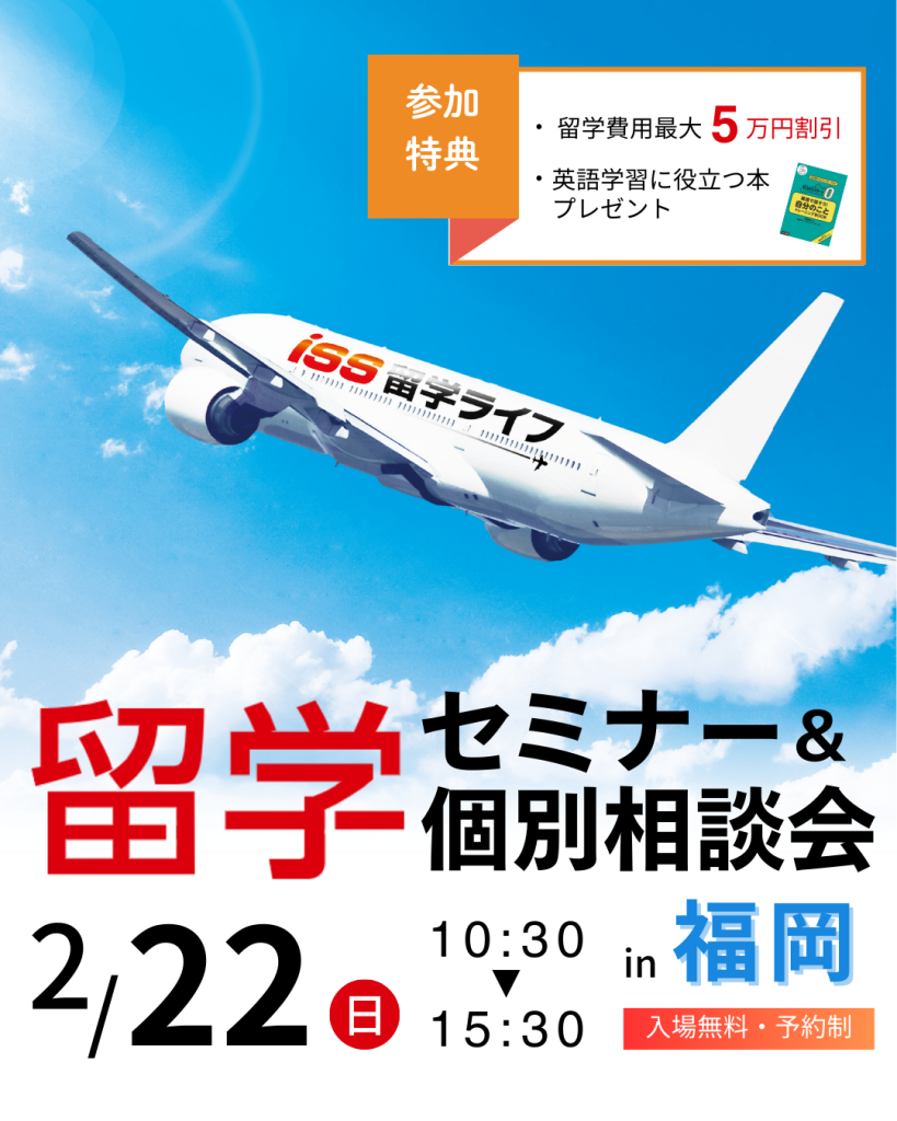 2025年12月7日 2/22(日)開催 留学セミナー&個別相談会 in 福岡 「留学って何から始めたらいいの?」という方におすすめの留学イベントが福岡で開催✨短時間で留学に必要な情報がしっかり学べるイベントです。基礎セミナー、小中高生向けの夏休み短期コース紹介、専門コンサルタントの個別相談会まで、1日で留学準備を一気に進められます。 またご参加の方限定のお得な特典も多数ご用意しています!詳細はこちらよりご覧ください。 一覧へ戻る