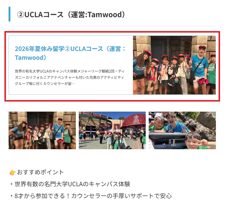 2026年夏休み留学②UCLAコース(運営:Tamwood)世界の有名大学UCLAのキャンパス体験メジャーリーグ観戦2回・ディズニーカリフォルニアアドベンチャーも付いた充実のアクティビティグループ毎に付くカウンセラーが留…