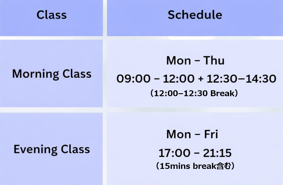 ※MorningクラスとEveningクラスと希望の時間帯のクラスが選べます。