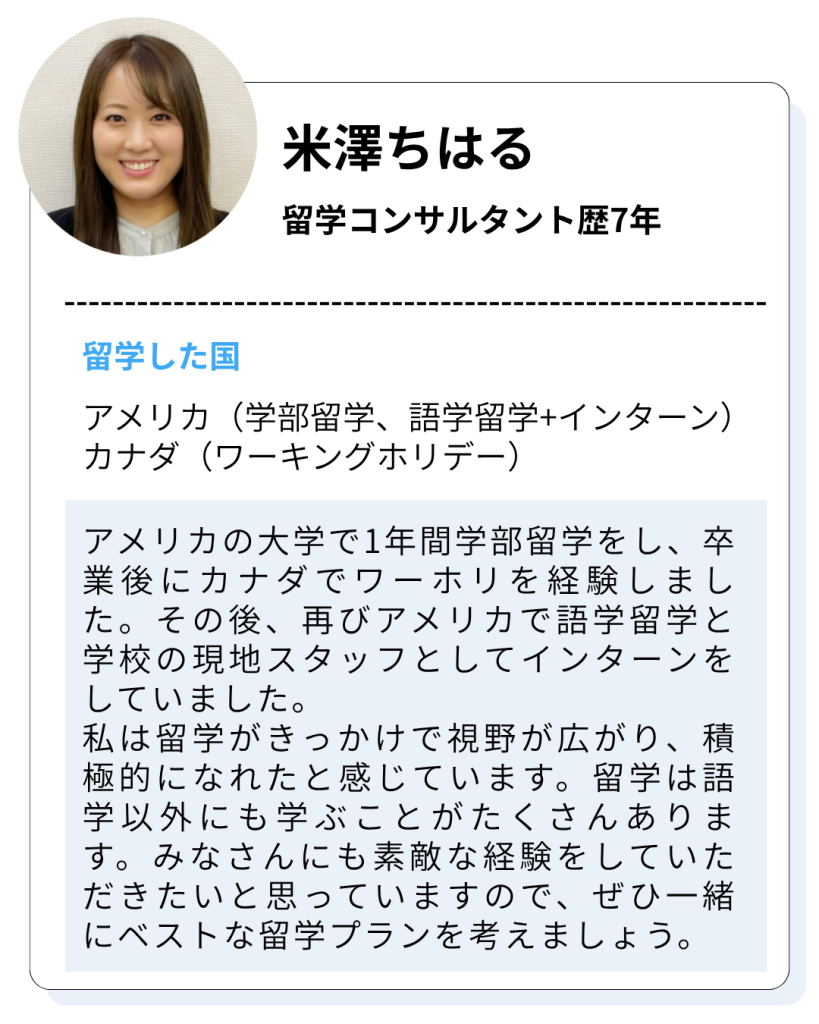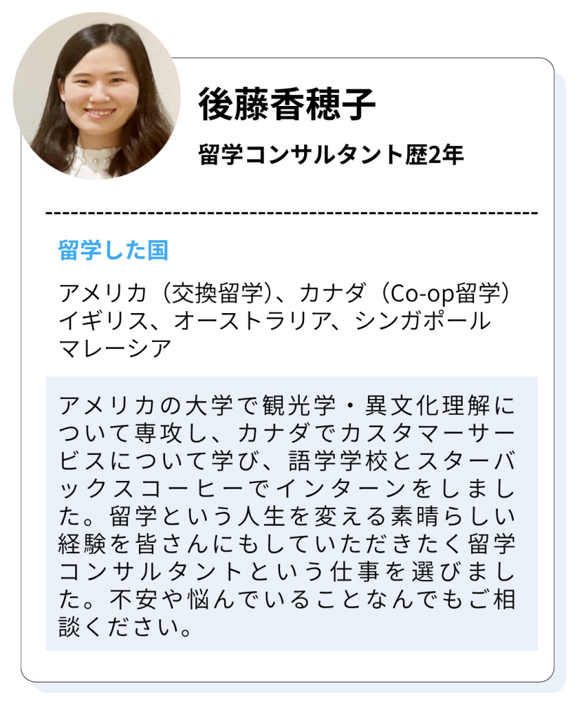 留学には、楽しみと同時に不安もつきものです。治安、生活環境、英語力、サポート体制など、気になることは人それぞれ。ISS留学ライフのコンサルタントは、全員が留学経験者です。自身の経験をもとリアルな情報をお伝えします。