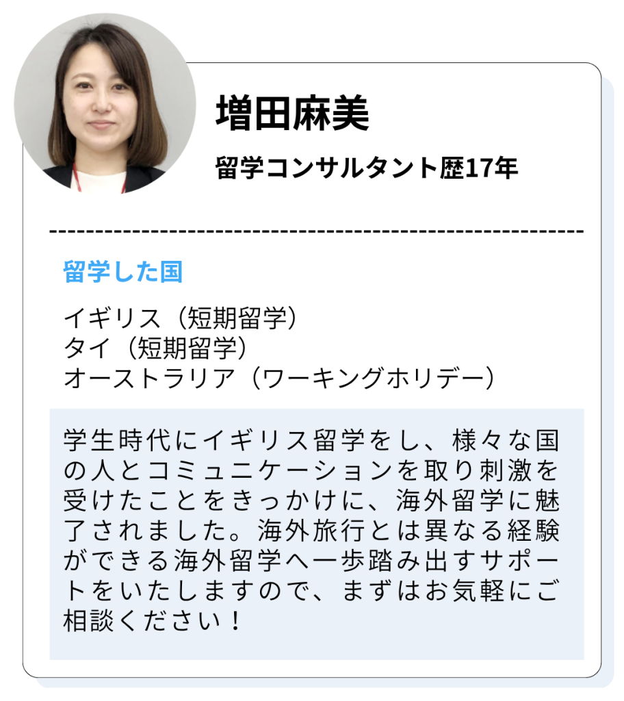 ISS留学ライフのコンサルタントは全員が留学経験者です。実際に留学を経験したからこそできるリアルなお話、お伝えできるアドバイスがたくさんあります!
