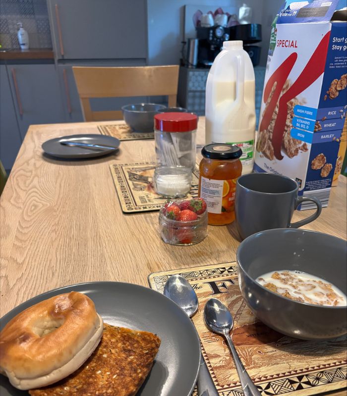 私は1週目はホームステイ、2週目は学校の寮で過ごしました。ホームステイではアメリカ育ちで在宅勤務をしている女性が迎えてくれました。とても優しくて、毎晩たくさん料理を作ってくれたり、友人と外食する時も柔軟に対応してくれました。朝ごはんは自分での用意でしたが、毎朝テーブルセッティングをしてくださっていて感動しました。